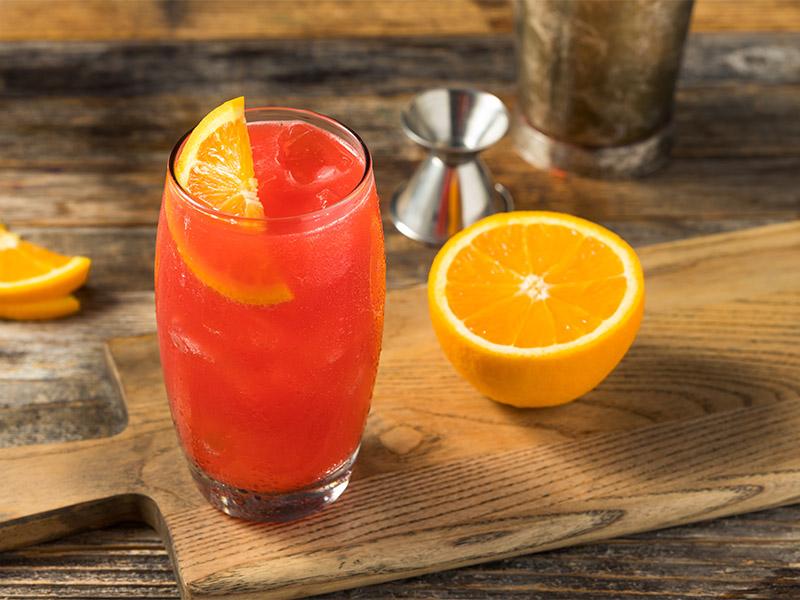 The orange juice brings together the variety of spirits and turns them into a fruity and refreshing cocktail.