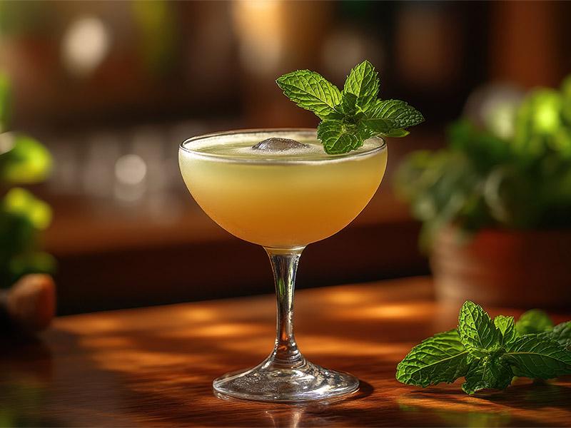 - Muddle the mint leaves in the cocktail shaker. Pour in all the ingredients and add some ice. Shale well until chilled.